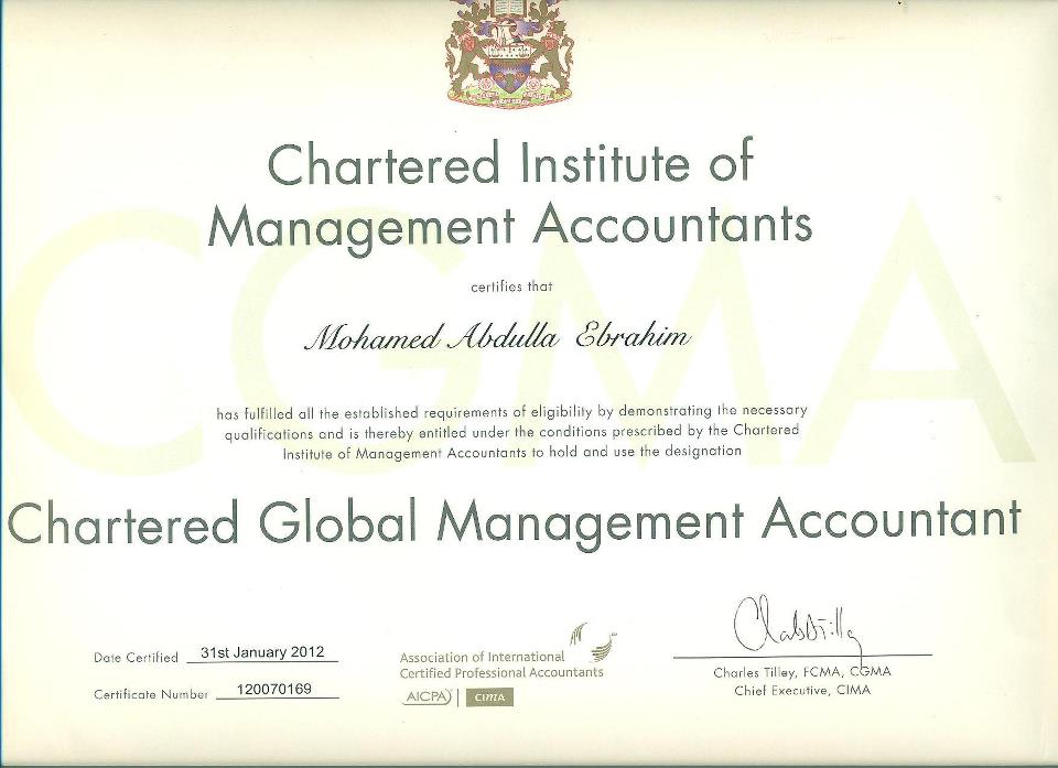 ACMA,CGMA, Member, Chartered Institute of Management Accountants and Association of International Certified Professional Accountants, registered as a CIMA Member in Practice.