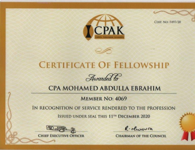 On 11th December 2020 Mohamed Ebrahim was awarded a Fellowship of the Institute of Certified Public Accountants of Kenya.